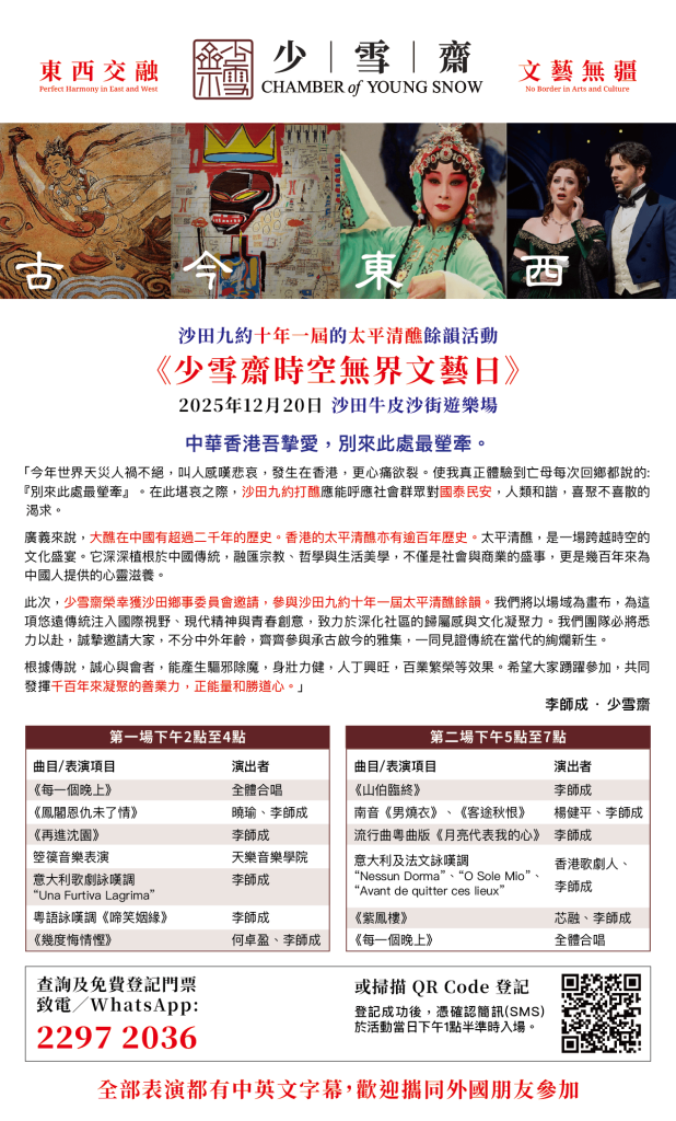 「少雪齋時空無界文藝日」將於 2025 年 12 月 20 日在沙田牛皮沙街遊樂場舉行,全日分為兩個主要場次: