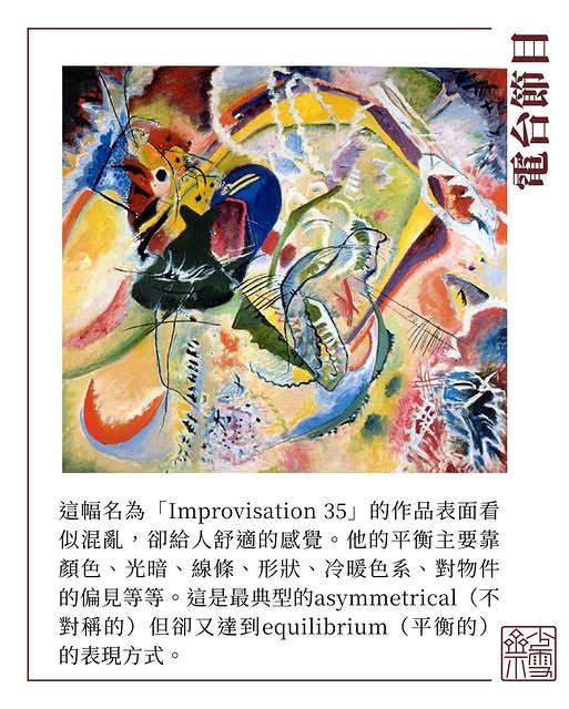 很多教師基於興趣願意與人分享知識,教學永遠是互相得益。人一生很多知識都是從老師成就過來,沒有老師就不能成就今天的知識分子。 今天會分享一幅由Wassily Kandinsky所創作的畫作,他於紐約博物館亦有自己的作品。這幅名為「Improvisation 35」的作品表面看似混亂,卻給人舒適的感覺。他的平衡主要靠顏色、光暗、線條、形狀、冷暖色系、對物件的偏見等等。這是最典型的asymmetrical(不對稱的)但卻又達到equilibrium(平衡的)的表現方式。