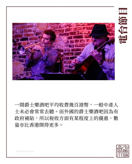 說回爵士音樂節,除了成功吸引大批人士到場欣賞,更成功邀請了著名的音樂家到場。從音樂節可見還有很多人是喜歡爵士樂的。香港的爵士樂酒吧相比其他外國酒吧可謂少之又少,現在甚至只剩餘一至兩間左右。可是香港是國際金融中心,更希望能吸引美國人的注視。爵士樂是美國的文化之一。在香港,平時喜歡爵士樂的觀眾大部份是中產階層的美國人。一間爵士樂酒吧平均收費幾百港幣,一般中產人士未必會常常去聽。而外國的爵士樂酒吧因為有政府補貼,所以稅收方面有某程度上的優惠,數量亦比香港開得更多。香港的教育制度亦有很多問題,即使學生在讀書時期學過多樣樂器或舞蹈,踏入社會後基本上也很少機會會再接觸。為了提高香港的藝術水平,這些都是政府應再想辦法加強改善的地方。
