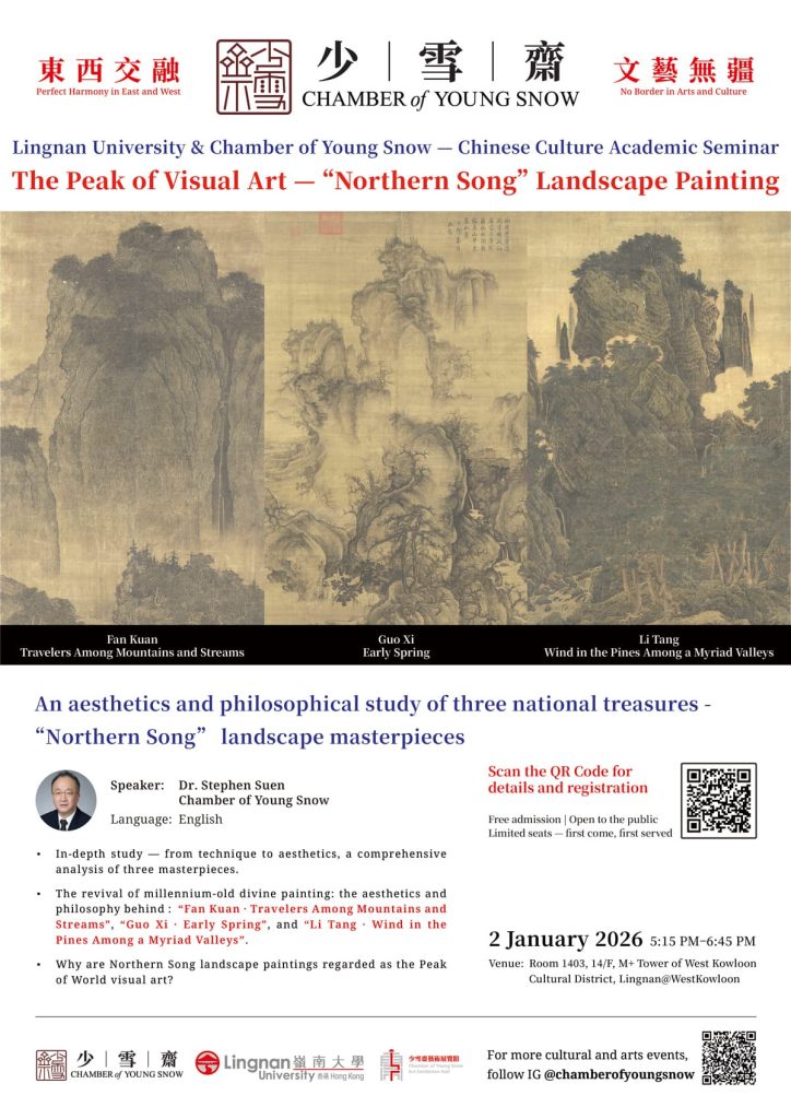 • The revival of millennium-old divine painting: the aesthetics and philosophy behind : “Fan Kuan · Travelers Among Mountains and Streams”, “Guo Xi · Early Spring”, and “Li Tang · Wind in the Pines Among a Myriad Valleys”.
